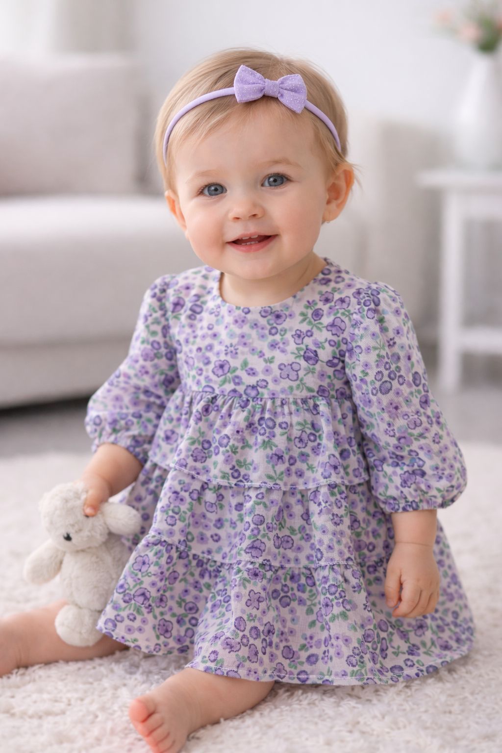 Rochița baby Stella lila este alegerea perfectă pentru fetițele care merită să strălucească în orice moment special. Realizată într-o nuanță delicată de coral roz, cu un imprimeu floral fin, această rochiță oferă un aspect elegant, dulce și feminin.